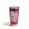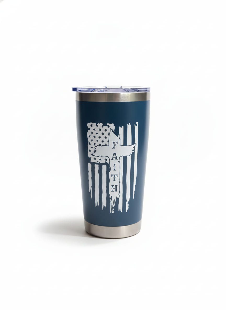 The stripes of the flag run vertically, and the canton, typically blue with stars, is replaced by a white cross. The word “FAITH” is spelled vertically down the center of this cross, also in white. The bottom of the tumbler has a silver metallic base.