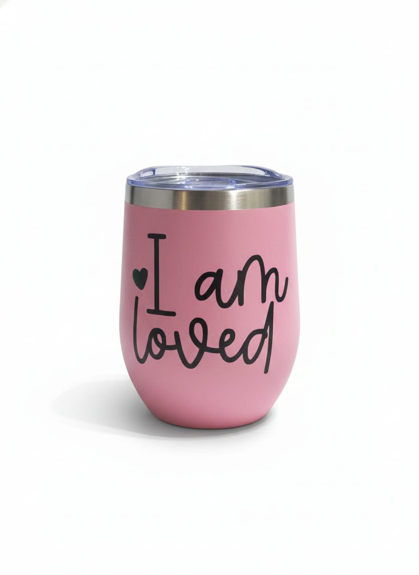 A pink insulated 10oz wine tumbler with a clear lid, featuring the phrase “I am loved” in black script lettering. A small black heart replaces the dot on the “i” in “I”.