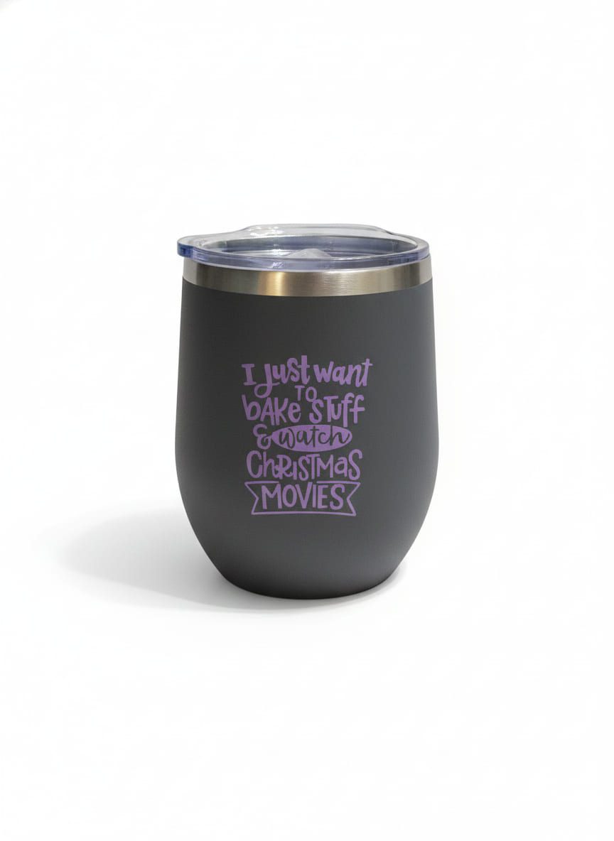 A dark gray, possibly charcoal, insulated 10oz wine tumbler with a clear lid, featuring the phrase “I just want to bake stuff & watch Christmas MOVIES” in purple lettering. The text is arranged in a vertical stack with varying playful fonts, with “Christmas MOVIES” being larger and enclosed by decorative angled brackets.