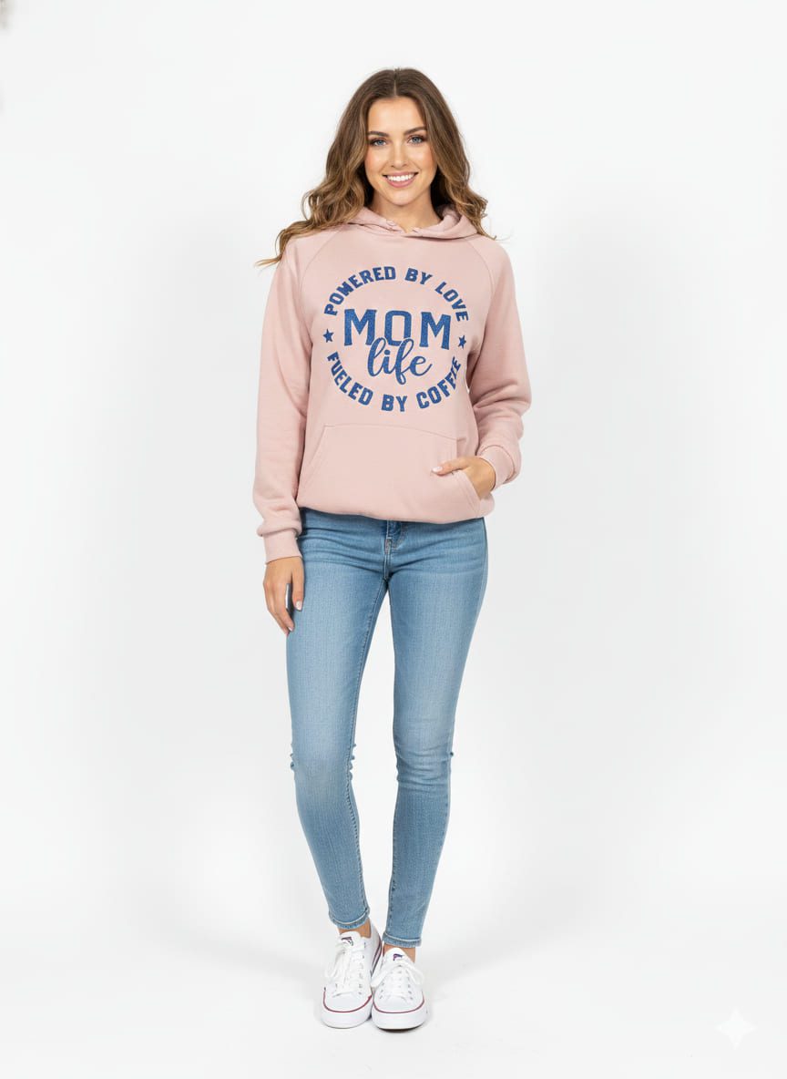 "Mom Life is the Best Life" Hoodie Showcasing the perfect blend of cozy style and relatable motherhood. This blush "MOM life" hoodie is worn by a smiling model, making it clear this is the essential garment for those powered by love and fueled by caffeine. The sparkling blue text stands out sharply against the soft pink fabric, emphasizing the fun and empowering message.
