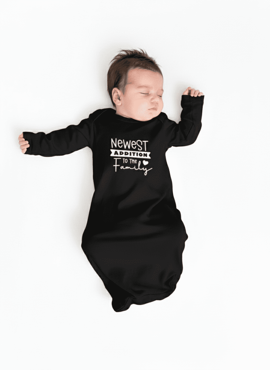A baby sleep gown, designed with long sleeves and a gathered bottom. Centered on the chest of the gown is a black graphic with the text “Newest Addition To The Family.” The words “Newest” and “ADDITION” are written in a bold, capitalized font, with “ADDITION” set inside a banner-like graphic. The gown is soft and made of a comfortable fabric, suitable for an infant.