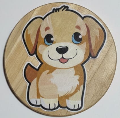 This coaster features a charming cartoon illustration of a light brown puppy with blue eyes, centered on a round, wooden background. The puppy has an endearing expression with a slight smile and rosy cheeks. Its fur is depicted with various shades of brown and white, and it has floppy ears and a wagging tail. A black outline defines the puppy’s form, separating it from the wooden circle. The wooden surface shows a subtle grain pattern, suggesting a natural and rustic feel. The overall impression is one of cuteness and warmth.