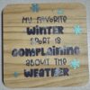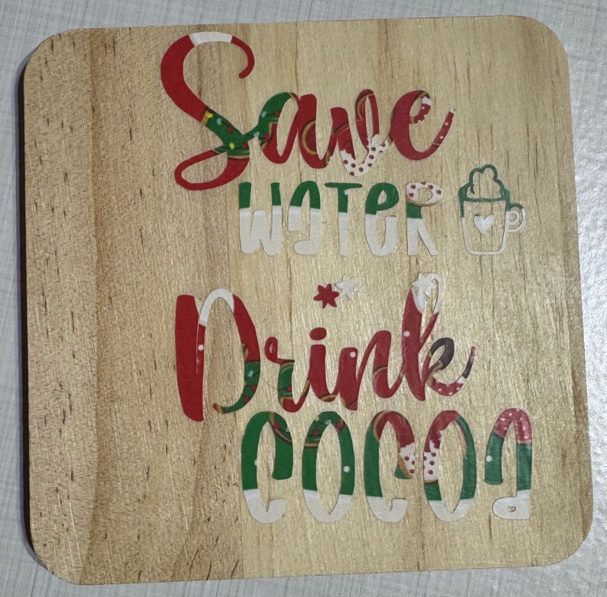 The Coaster displays a square-shaped coaster with rounded corners, featuring a playful and festive hot cocoa-themed message.