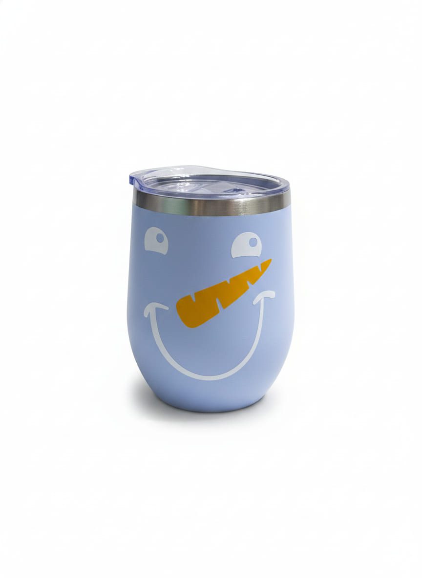 A light blue, stemless 10oz wine tumbler with a clear lid.The tumbler features a cheerful snowman face design: two white circles with black centers for eyes, an orange carrot-like shape for a nose, and a white curved line forming a smile.