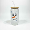 A frosted glass can with a wooden lid and a clear straw. The glass is decorated with a snowman’s face, including two black eyes, an orange carrot nose, and a black wavy line for a smile. Several blue and purple snowflake decals are scattered across the glass, enhancing the winter theme.