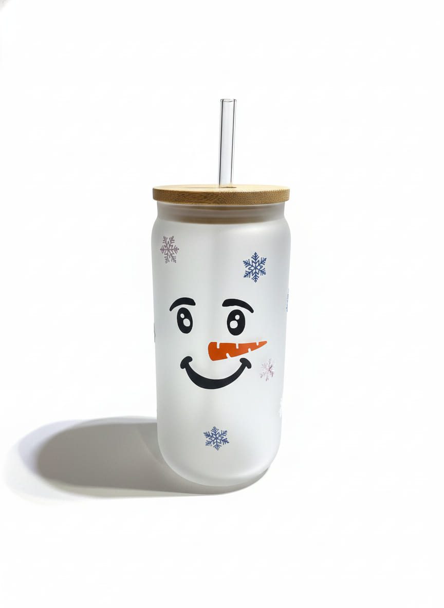 A frosted glass can with a wooden lid and a clear straw. The glass is decorated with a snowman’s face, including two black eyes, an orange carrot nose, and a black wavy line for a smile. Several blue and purple snowflake decals are scattered across the glass, enhancing the winter theme.