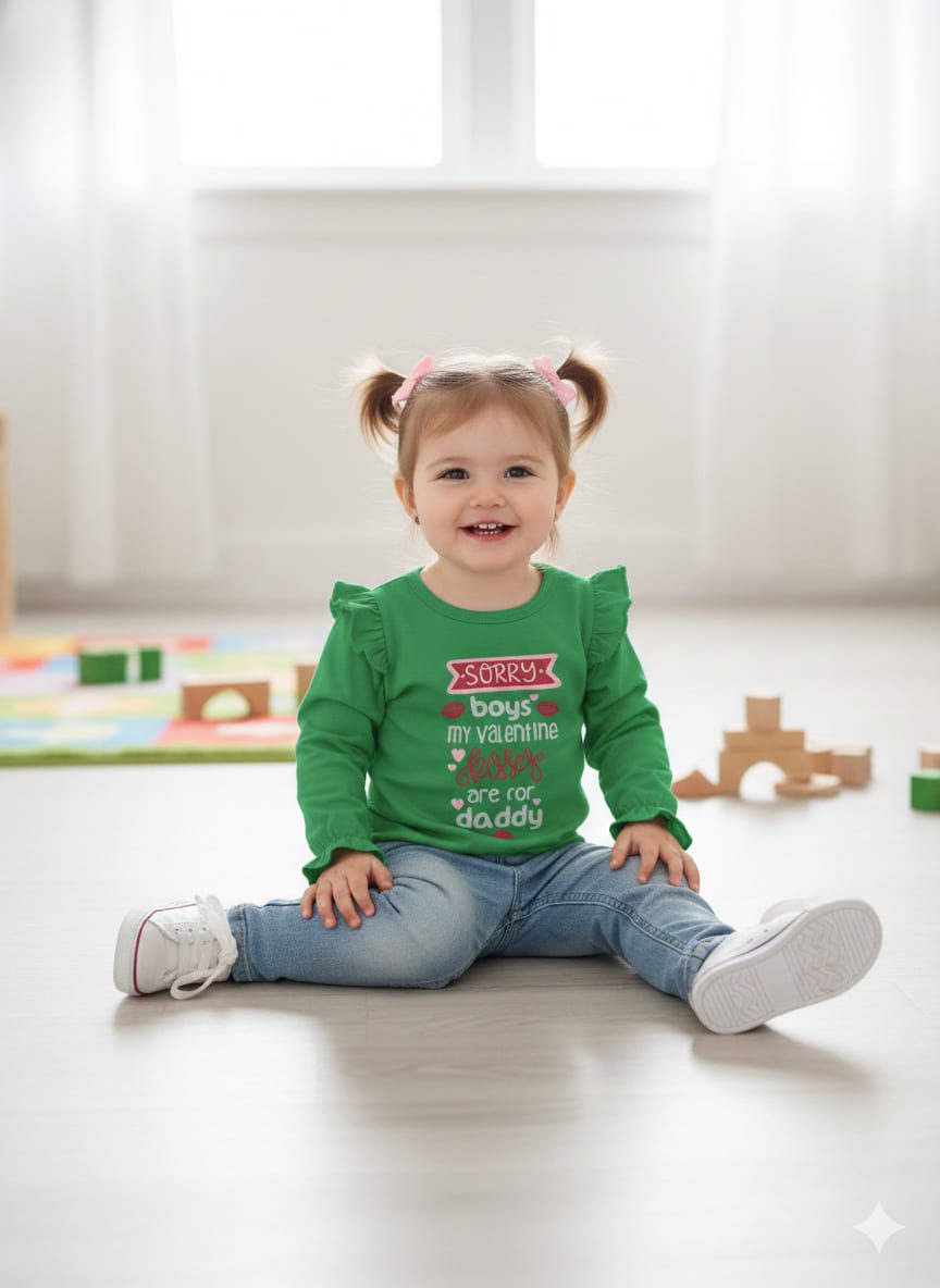 💖 "Sorry Boys, Kisses are for Daddy" Ruffled Toddler Tee This adorable long-sleeve ruffled tee is perfect for your little sweetheart! Featuring a playful Valentine's Day-themed graphic, it's a sweet and sassy statement piece for any toddler girl. Design: Long-sleeve shirt with cute ruffle detailing on the shoulders and cuffs. Graphic: A charming and colorful design that reads: "SORRY BOYS • my valentine KISSES are for DADDY" adorned with stylized lips and hearts. Material: Soft, comfortable, and durable cotton-blend fabric, perfect for sensitive toddler skin and all-day play. Occasion: Ideal for Valentine's Day, family photos, or everyday wear to show some daddy-daughter love!