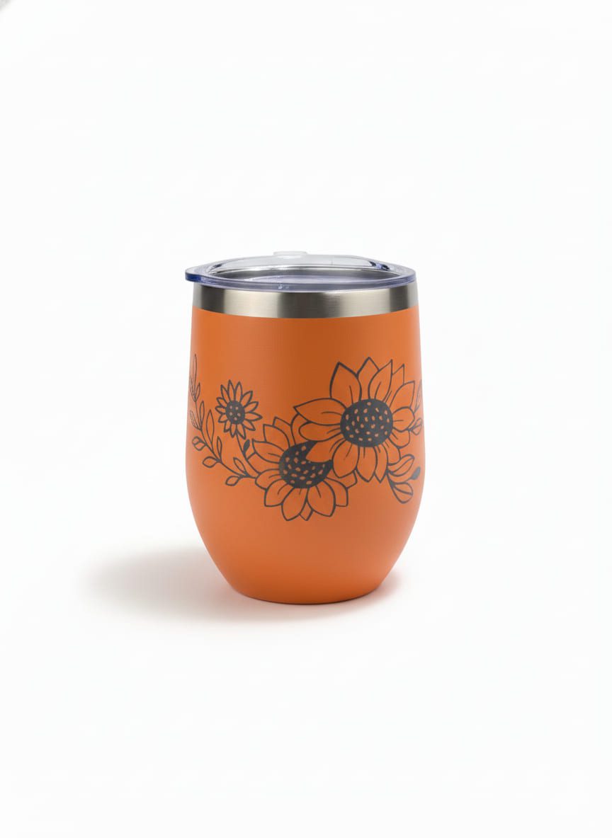 A vibrant orange insulated 10oz wine tumbler with a clear lid, adorned with a black outline illustration of sunflowers and accompanying foliage. The design features multiple sunflower heads with their characteristic centers and petals, along with leafy branches.