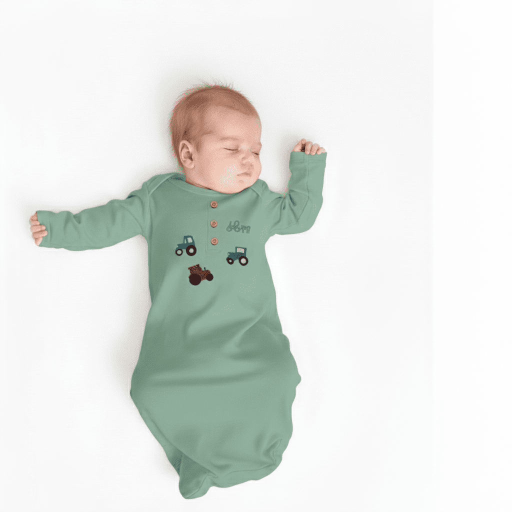 A light sage-green baby knotted gown (size 0–3M) as a soft fabric. The gown has three wooden buttons on the chest and features four colorful tractor-style vehicle graphics. The gown’s bottom is tied in a loose knot and a cute tie hat to match.