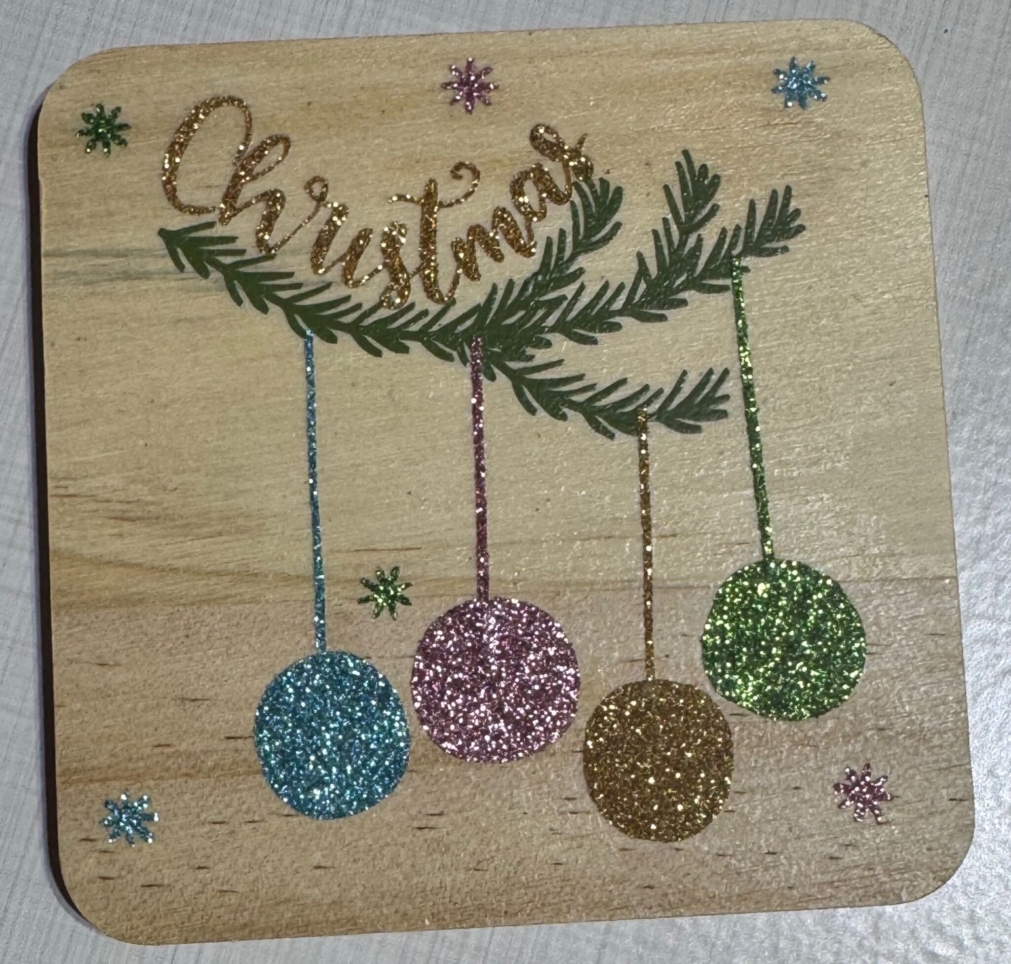 ​The coaster displays a square-shaped coaster with rounded corners, featuring a festive and glittery Christmas ornament design.