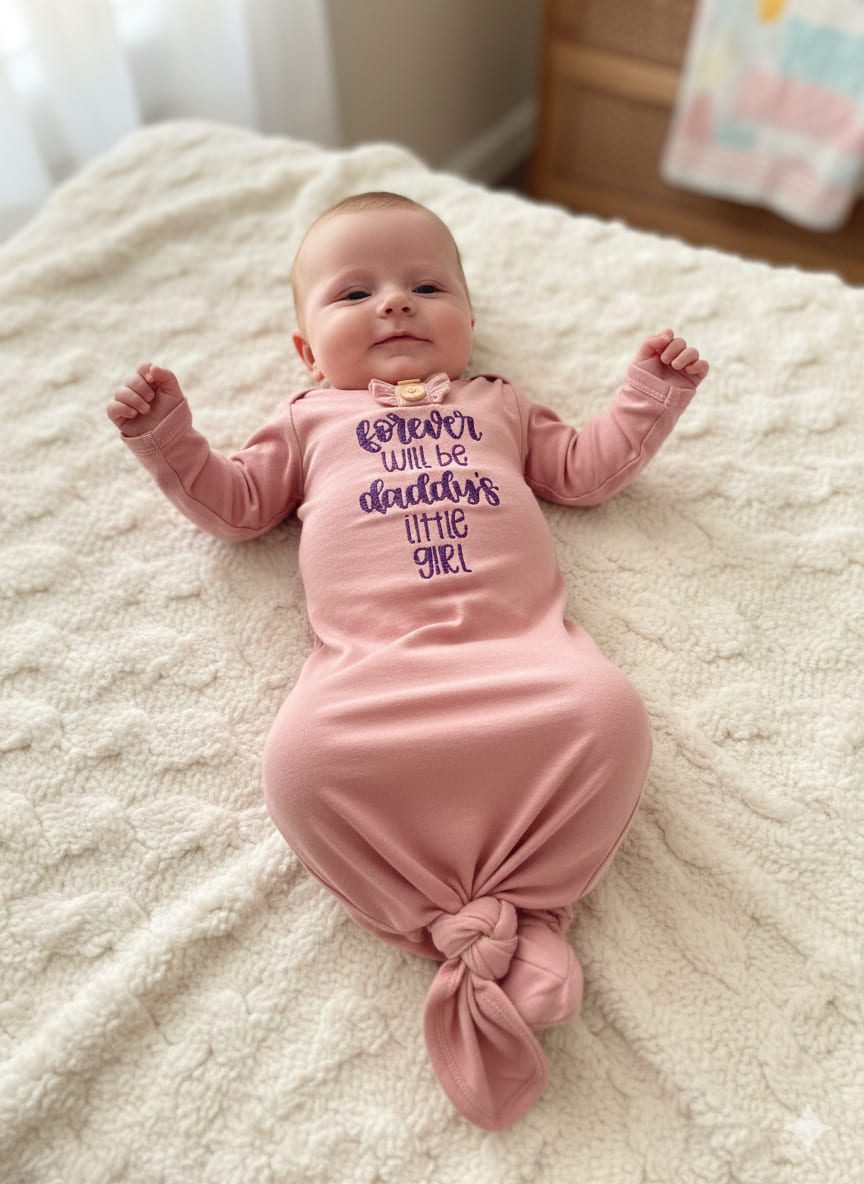 Adorable baby outfit with long sleeves and three small decorative buttons. Features the sweet purple embroidered phrase: “forever will be daddy’s little girl.”