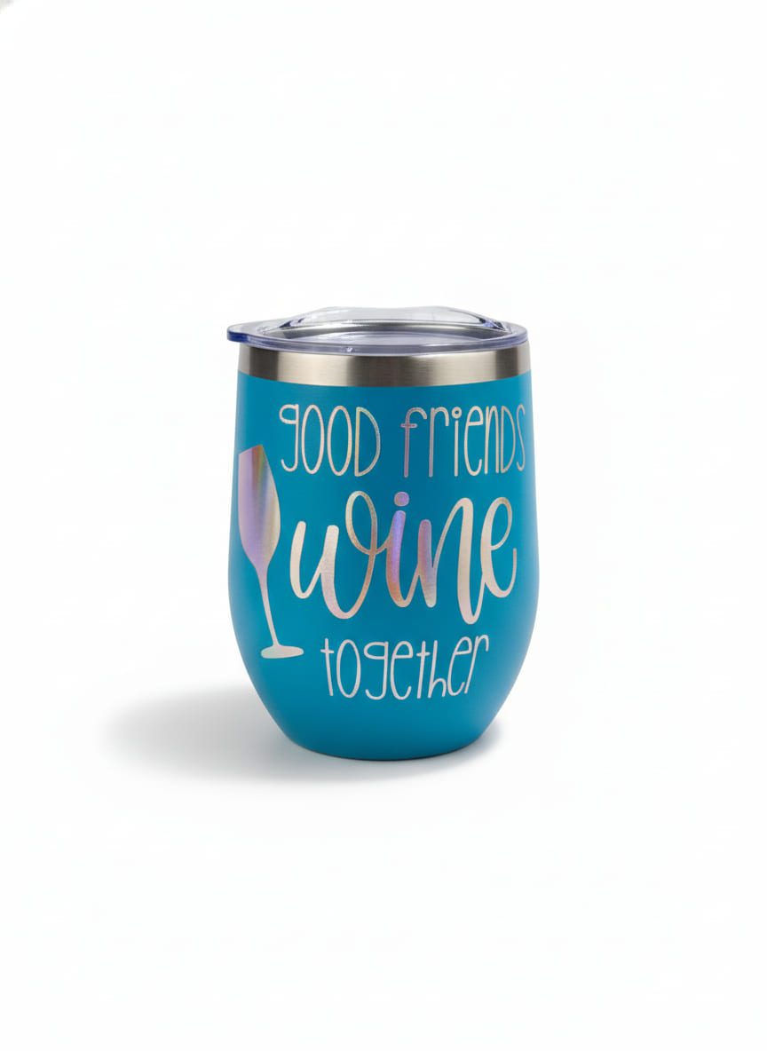 A vibrant blue insulated 10oz wine tumbler with a clear lid, featuring the phrase “GOOD FRIENDS wine together”. “GOOD FRIENDS” and “together” are in a white, slightly distressed block font, while “wine” is in a larger, iridescent or holographic script font that shimmers with various colors.