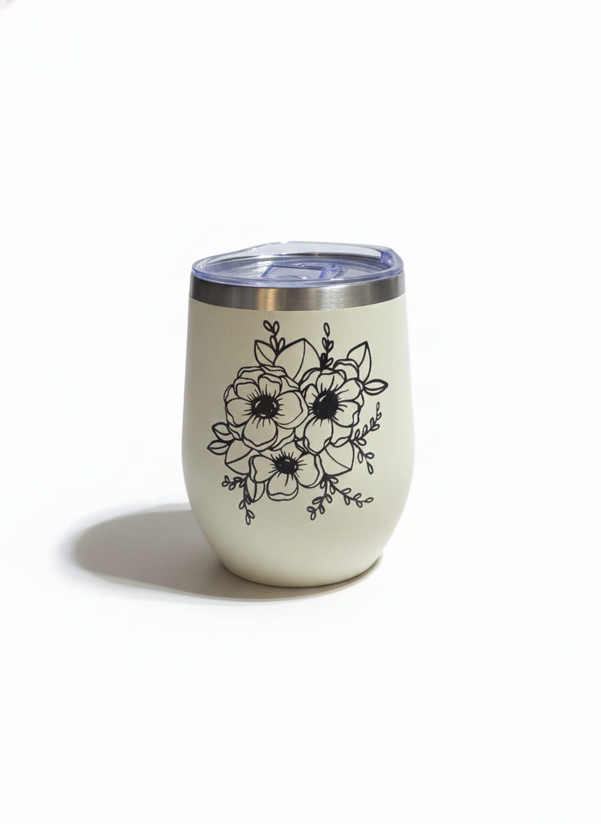 A cream or off-white insulated 10oz wine tumbler with a clear lid, decorated with a black outline illustration of a floral bouquet. The bouquet comprises several flowers and accompanying foliage, centrally placed on the tumbler’s surface.