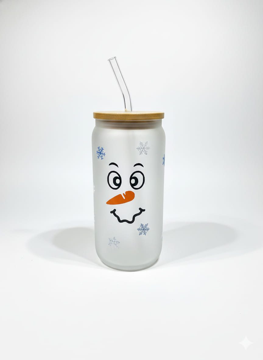 A frosted glass can with a wooden lid and a clear straw. The glass is decorated with a snowman’s face, including two black eyes, an orange carrot nose, and a black wavy line for a smile. Several blue and purple snowflake decals are scattered across the glass, enhancing the winter theme.