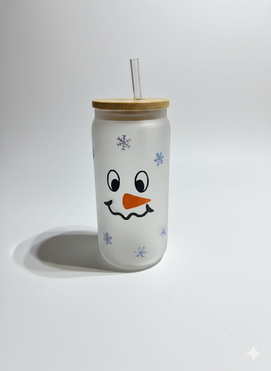 A frosted glass can with a wooden lid and a clear straw. The glass is decorated with a snowman’s face, including two black eyes, an orange carrot nose, and a black wavy line for a smile. Several blue and purple snowflake decals are scattered across the glass, enhancing the winter theme.